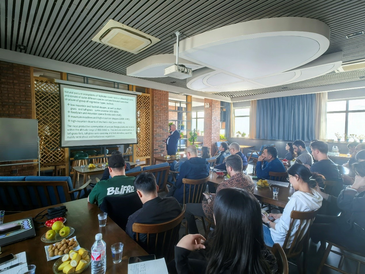 Hikmat Hisoriev用详实的数据揭示了塔吉克斯坦草原生态系统正面临的严峻挑战,过度放牧、管理不当和气候变化正导致草场退化,一些珍稀特有物种正因此走向濒危。在报告中,他特别强调了海拔800-3000米这一“黄金地带”的生态价值。这里分布着三类高产牧草群落:生机勃勃的高草-草群落、错落有致的高草-半稀树草原群落,以及物种丰富的高草-草甸群落。这些以半灌木和草本植物为主的植被系统,构成了塔吉克斯坦草原的生命基石。他建议,要建立科学的放牧管理制度,尊重植物生长的自然节律;要加强濒危物种保护,提升生态系统韧性;更要积极应对气候变化,探索可持续的牧场管理模式。报告结束后,与会师生就塔吉克斯坦草地管理政策的优化路径、退化牧场生态功能提升的技术方案等议题进行了深入交流。