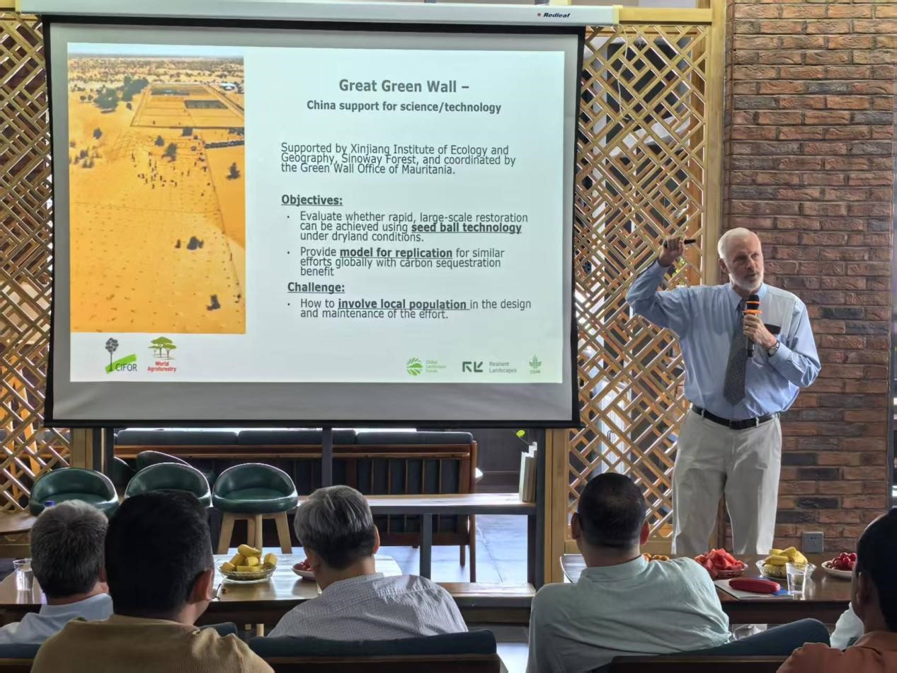 Gilruth博士以“荒漠化与土地退化的历史性展望:政策与科学”为题,从全球视角切入,重点分析了非洲地区的治理经验,并回溯了联合国系统在政策与科学层面的早期努力。随后,他聚焦中国经验,并将其划分为三阶段:从初期探索到“三北防护林”等系统工程,再到与国际标准接轨。他特别指出:“新疆的防沙治沙技术(尤其是工程治沙和生物治沙相结合的模式)为全球干旱区退化土地恢复提供了范例,中国有望率先实现2030年土地退化零增长目标。”