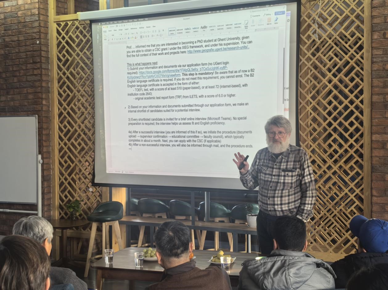 在随后的互动环节,菲利普教授详细介绍了根特大学与新疆生地所的联合培养博士研究生项目,并就申请流程与关键节点为学生们提供了指导。他鼓励大家积极与导师联系,充分利用学术交流机会展示自身能力,为深化中比学术合作与人才培养贡献力量。