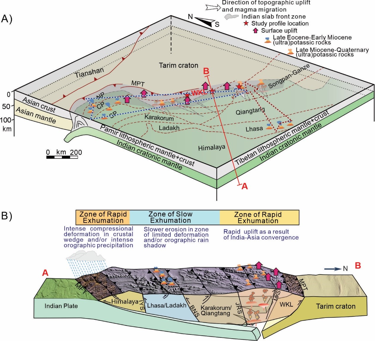 研究表明,11–10 Ma的快速隆升对应于印度与塔里木板块的初始“硬碰撞”。该事件导致印度-欧亚板块汇聚速率在约11 Ma后显著减缓并趋于稳定,同时引发了西昆仑地区在≤10 Ma的(超)钾质岩浆活动,以及青藏高原及周缘造山带(如天山)在约11 Ma普遍记录的隆升响应。值得注意的是,自渐新世以来,冷却年龄与(超)钾质岩浆活动年龄呈现出从高原内部(羌塘-拉萨地块)向西昆仑逐渐变年轻的趋势。这一时空演变规律受控于印度板块持续向北楔入亚洲的深部动力过程。印度板片的俯冲、碰撞及其后期撕裂,共同调控了高原的“向外生长”与“岩浆迁移”。