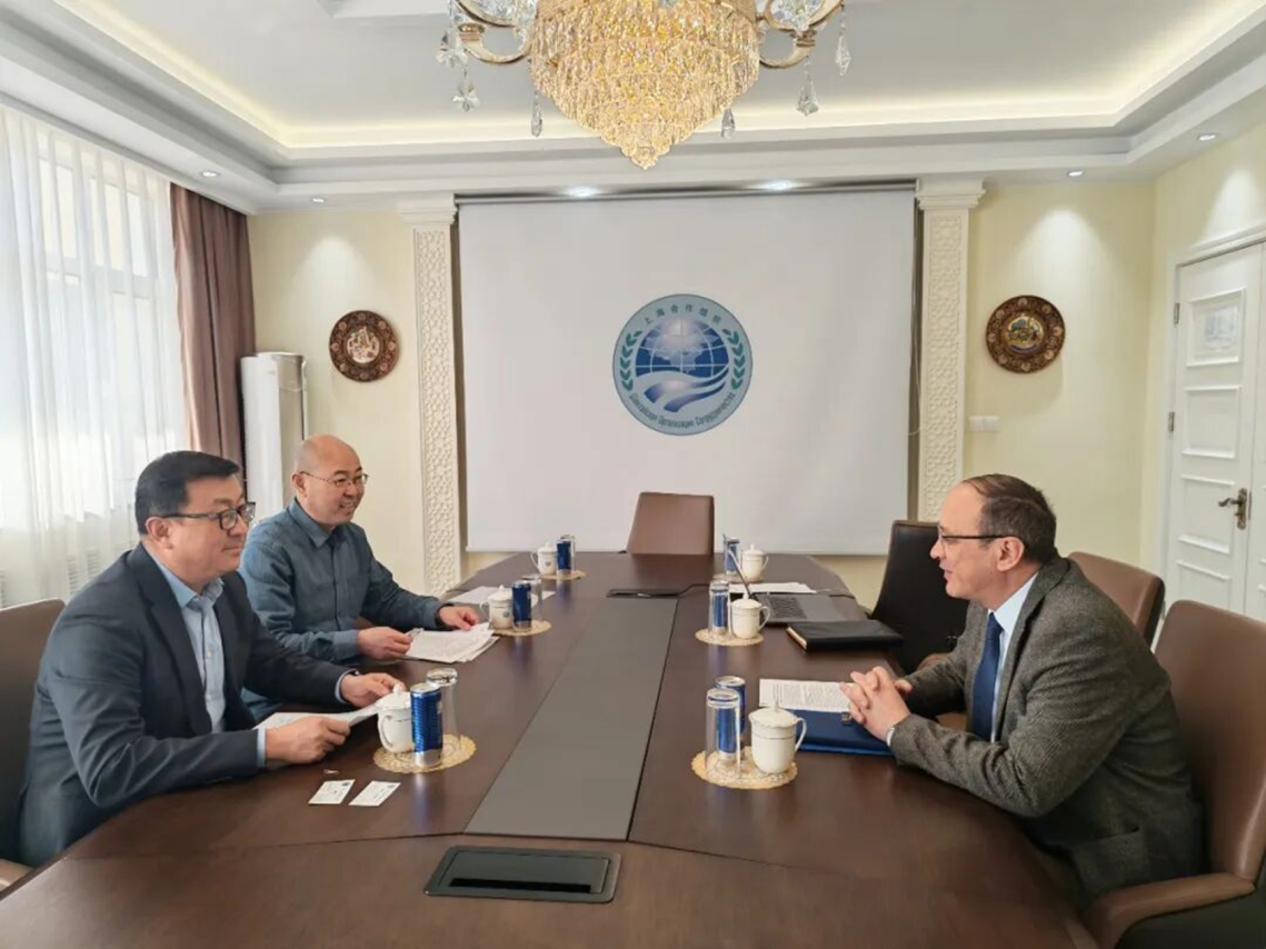 1月13日,中国科学院新疆生态与地理研究所张元明所长一行访问上海合作组织秘书处,并与副秘书长图尔苏诺夫进行会谈。