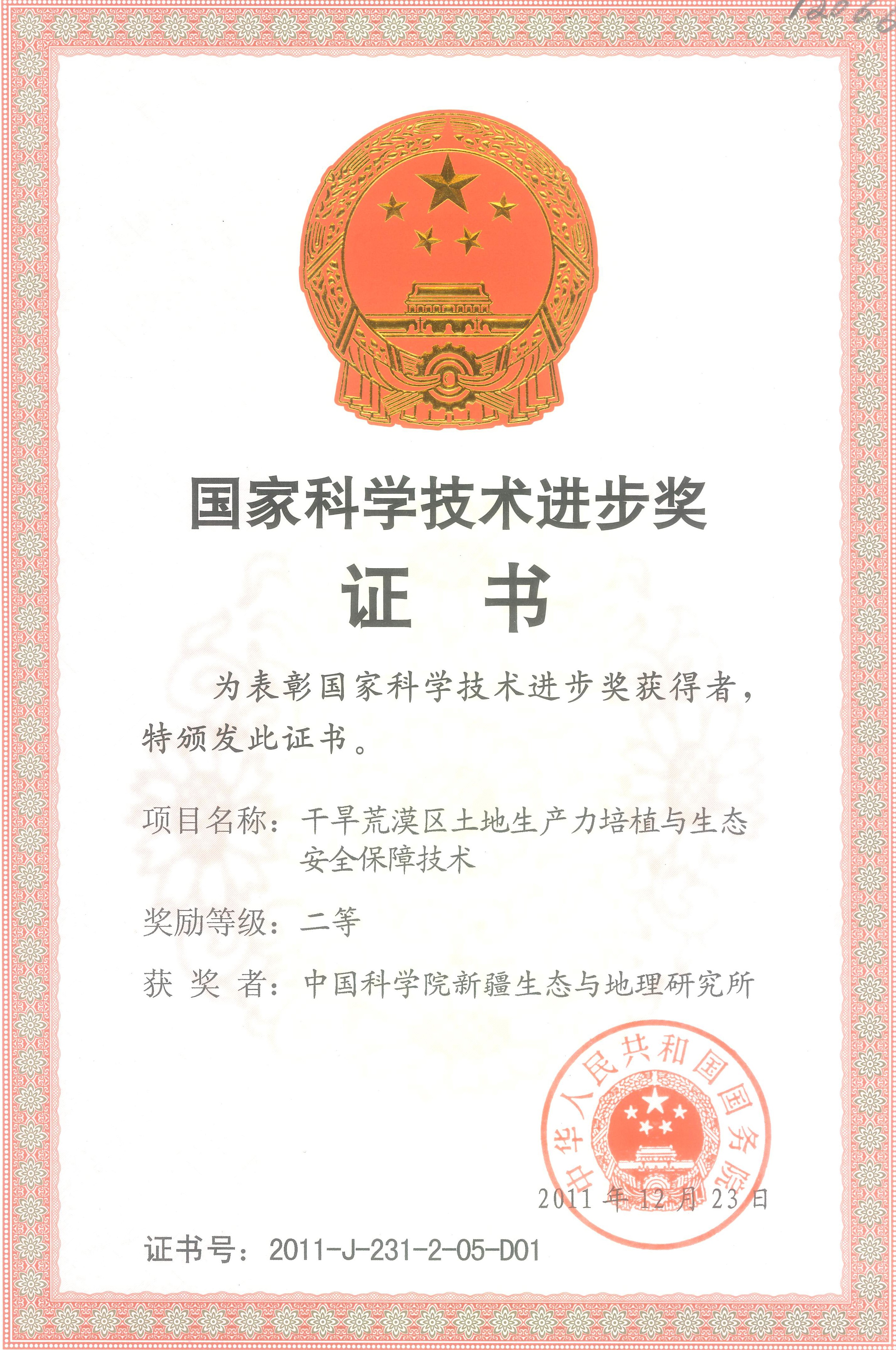 干旱荒漠区土地生产力培植与生态安全保障技术”,该成果面向国家西部大开发生态综合治理目标,以干旱荒漠区水土资源开发与生态保护为主要研究对象,针对新疆干旱荒漠区新垦土地贫瘠、土壤次生盐渍化严重、绿洲-荒漠过渡带萎缩、绿洲外围荒漠生态系统受损等以及绿洲农业面临的干旱、盐碱、风沙三大环境问题,在新垦绿洲区重点开展了以土壤盐渍化治理与功能改善、土地生产力提升、地表水、地下水联合利用等为主要内容的绿洲生产力培植与水土生态安全调控技术的研发与试验示范;在绿洲-荒漠过渡带重点开展了绿洲-荒漠过渡带植被建植微咸水利用技术、绿洲-荒漠过渡带逆境造林技术以及以人工绿洲与天然绿洲的互存、荒漠植被与人工植被的生态融合、绿洲边缘荒漠林与人工防护林体系生态整合等为主要内容的生态融合技术的研发与试验示范;在绿洲外围荒漠生态脆弱区,重点开展了包括荒漠植被保育恢复、退化生态系统改造恢复等为主要内容的干旱荒漠区退化生态系统综合治理技术的研发与试验示范;在区域尺度上,提出了集绿洲外围风沙沉降带、绿洲边缘骨干防护林、绿洲内部林网等 "三位一体"的干旱荒漠区绿洲防护生态安全保障体系建设模式。该项目获2011年国家科技进步二等奖。