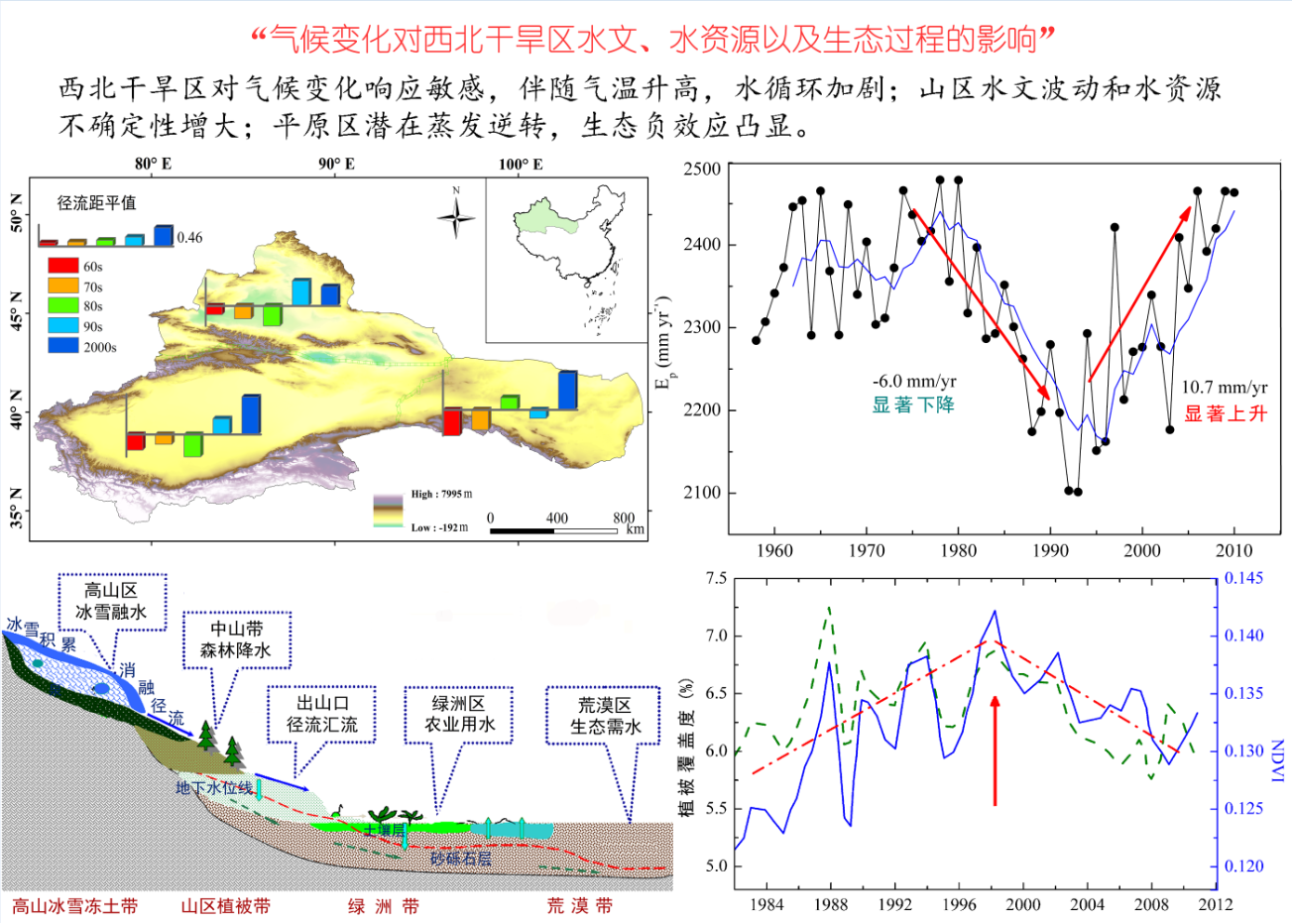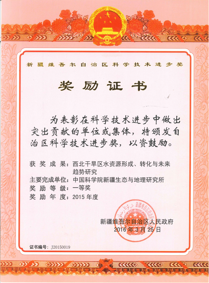 “西北干旱区水资源形成、转化与未来趋势研究”,该成果以西北干旱区典型流域为代表,通过现代观测手段和数值模拟方法研究干旱区径流构成及其时空变化规律,揭示了水资源构成组分变化与气候变化间的关系;建立了分布式水资源模型,模拟复演过去50年水资源供需情况,并通过情景分析模拟研究气候变化与人类活动对水资源的影响;根据未来气候变化情景和社会经济发展情景预估未来水资源需求及变化趋势,预估未来50年水资源供需的可能变化,提出了应对气候变化的水资源管理对策。 该项目被评为2015年度自治区科技进步一等奖。