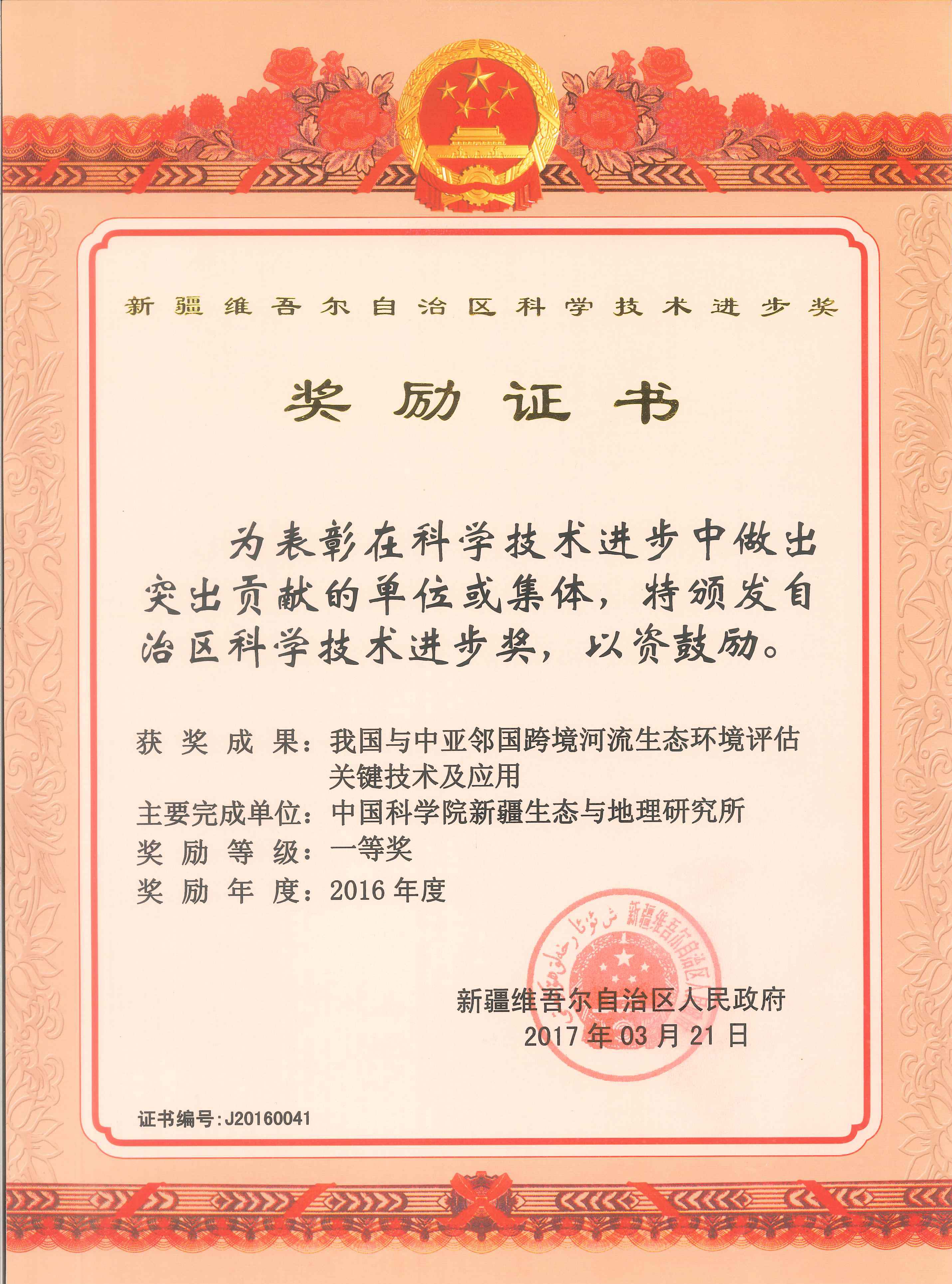“我国与中亚邻国跨境河流生态环境评估关键技术及应用”,该成果利用遥感和GIS技术、统计学与现代模拟技术结合的手段,开展了中亚水土资源和生态系统监测与评估关键技术及应用研究。项目建立了跨境河流区域野外生态系统观测站、生态环境遥感监测平台,研发了一批干旱水文水资源计算与预测、生态环境监测与评估的关键技术。从水安全与生态安全角度提出了跨境河流生态保护的咨询建议,得到国家领导人批示,开创了我国对中亚跨境河流资源与生态环境合作研究新模式。该项目被评为2016年度自治区科技进步一等奖。