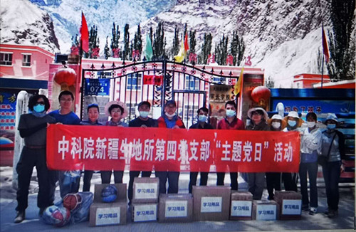 在科考前的预调研中,科考队员了解到本次科考路线途径的塔什库尔干塔吉克自治县大同乡,地处帕米尔高原山区,远离县城,雨季山体滑坡频发,道路经常被冲断,交通不便,当地居民生活水平较为贫困,学生的学习条件有限,文具和体育用品短缺。因此,野外科考临时党小组积极号召和组织考察队员自愿向大同乡小学捐款3620元,用于购买学习和体育用品,并在考察队途经大同乡小学时开展了捐赠学习和体育用品的主题党日活动,受到大同乡小学校长、老师和同学们的热烈欢迎。