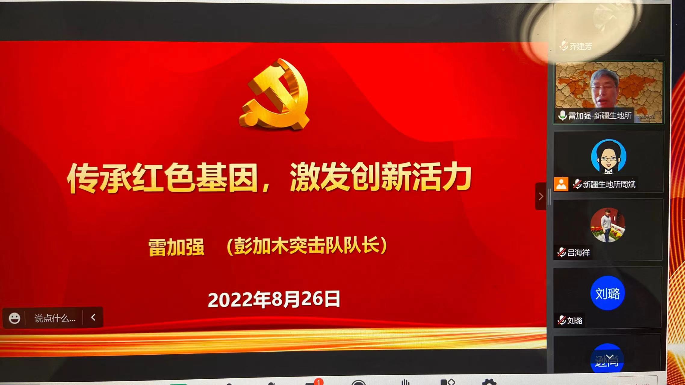 8月26日,中国科学院新疆生态与地理研究所第六党支部开展“弘扬科学家精神”的主题党日活动。活动邀请“彭加木突击队”队长雷加强研究员做专题报告,研究所党委书记、副所长张向军以普通党员身份参加学习研讨,第六党支部书记乔建芳主持活动。