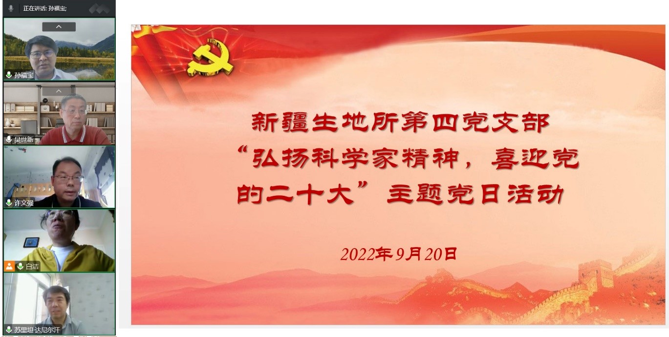 为营造尊重知识、崇尚创新、尊重人才、热爱科学、献身科学的氛围,大力宣传弘扬“爱国、创新、求实、奉献、协同、育人”的新时代科学家精神,进一步加强党员作风和学风建设,推进支部党建工作,发挥好支部党员在科研一线的战斗堡垒和先锋模范作用,以良好的精神面貌喜迎党的二十大胜利召开,9月20日,中国科学院新疆生态与地理研究所第四党支部开展了“弘扬科学家精神,喜迎党的二十大”主题党日活动。