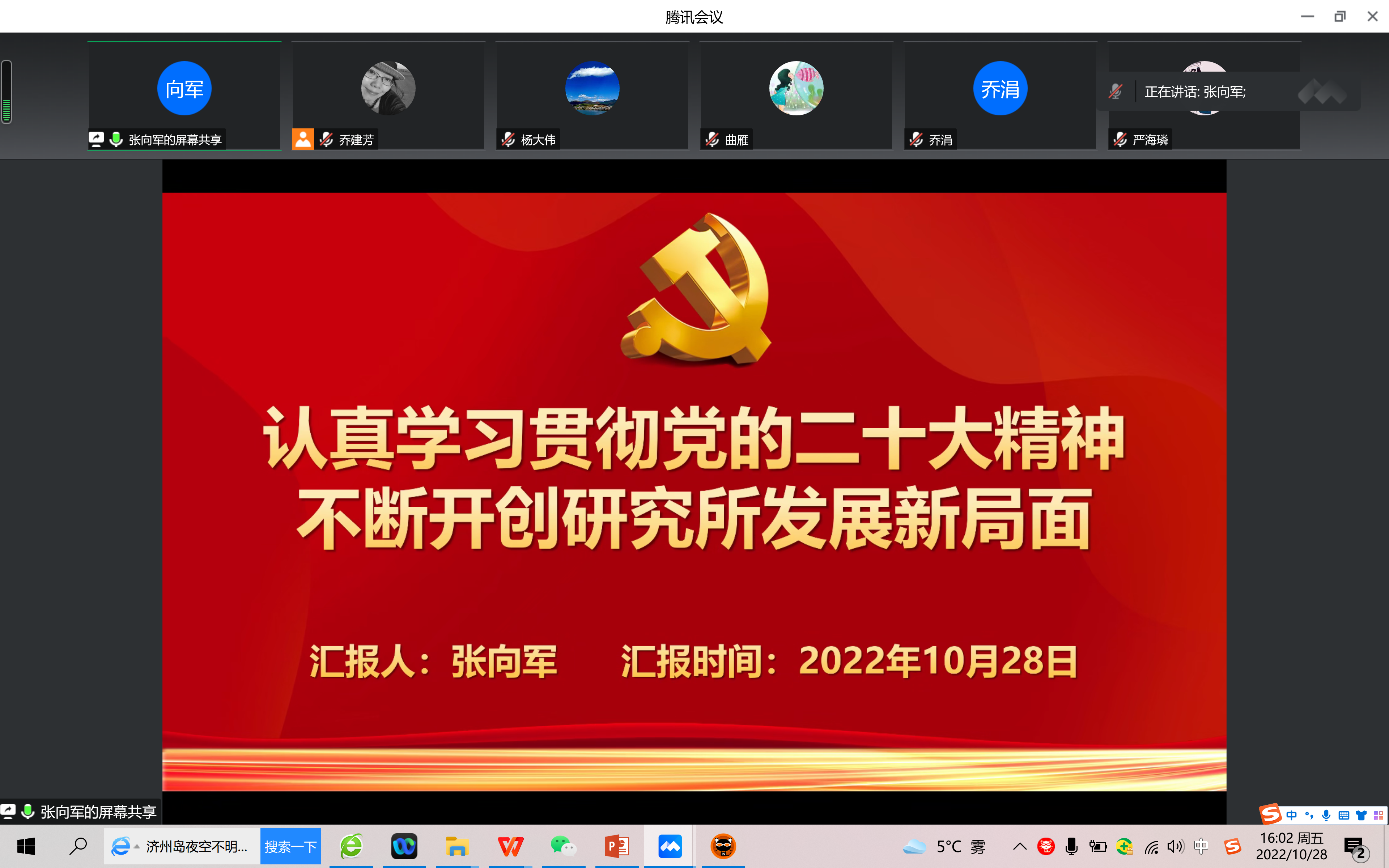 与会同志畅谈学习体会,各党小组代表在线交流发言,大家一致认为,上了一场有实感、有实招、有实效的高质量学习二十大精神“云”党课。大家一致表示,一定紧密团结在以习近平同志为核心的党中央周围,坚定不移在思想上政治上行动上同以习近平同志为核心的党中央保持高度一致,全面贯彻落实党的二十大精神,落实研究所工作部署要求,创新服务方式,提升管理效能,持续深入做好研究所科技创新发展服务保障工作。