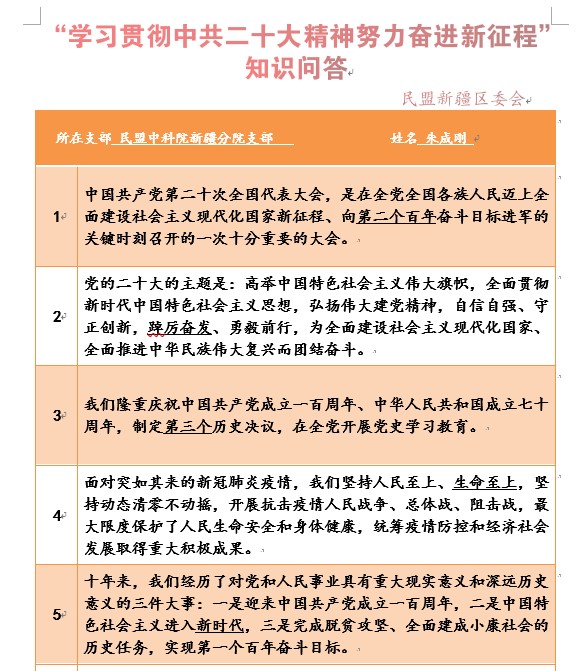 近日,为积极引导广大盟员深刻领会和把握大会精神实质和丰富内涵,切实把思想和行动统一到党的二十大精神上来,把力量凝聚到党的二十大确定的各项任务上来,在研究所党委的号召下和民盟新疆区委会“全面宣传贯彻和学习党的二十大精神”倡导与组织下,民盟中科院新疆分院支部我所职工通过微信公众号平台和工作群组织开展了“学习贯彻二十大精神,努力奋进新征程”知识问答学习活动。民盟科学院支部共计30余人、其中我所职工10余人参加了知识问答的学习,继收看二十大开幕式学习活动后,再次掀起学习贯彻党的二十大精神的热潮。