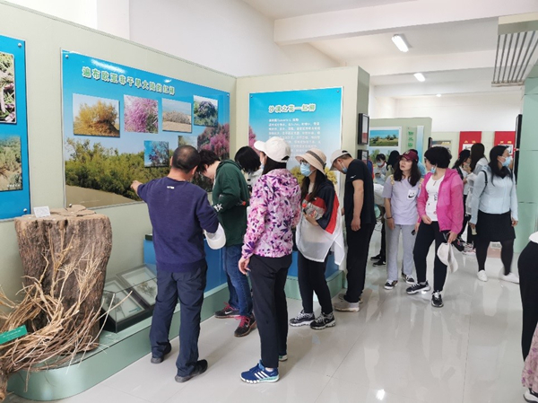 在中国科学院新疆生态与地理研究所王喜勇博士的带领下,教师们参观了植物园的科普展馆,了解了植物园的建园历史和荒漠植物收集特色;在参观荒漠植物种植区时,教师们纷纷感慨红柳、梭梭、胡杨等荒漠植物顽强的生命力,感受到它们不屈的身姿和顽强的精神;在瞭望塔上鸟瞰全园,近处郁郁葱葱,远处风沙荒凉,植物园就像一块碧玉镶嵌在沙海之中,胜为壮观。一位老师动情的说:“植物园守护着周边的绿洲,看着远处的沙包,就知道这些植物生长得多么不易,在这里工作和坚守的人多么无私,要让我们的学生也来到这里,感受植物带来的变迁和科学家们无私奉献的精神!”