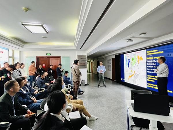 肖文交主持报告,并对Lin进行了简要介绍。报告中,Lin首先介绍了北美大陆的地质演化历史及北美Appalachian增生造山带的特征和形成机制。接着从宏观的古大陆聚-散视角到详细的年代学实验数据分析等方面来阐述我国华南东部各个造山带的特征。他从板块构造理论出发,用活动论的思想,将我国华南东部造山带与北美大陆造山带的演化特征进行对比,从新的视角提出了华南不同阶段造山带的形成机制与演化模式。