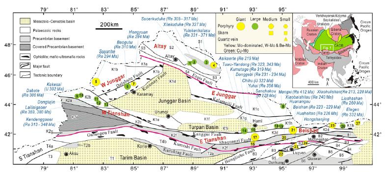 中亚造山带是全球最大最典型的显生宙增生造山带,经历了长期复杂的洋盆打开、洋壳俯冲和陆陆碰撞等演化过程,蕴藏着各种类型的大型矿床。西北地区处于中亚造山带中心位置,近年来钼矿床勘查取得重大进展,先后发现了东戈壁、白山和苏云河三个超大型钼矿床。中国科学院新疆矿产资源研究中心周可法研究员团队等收集了西北地区27个钼矿床(斑岩型22处、矽卡岩型4处和石英脉型1处)(图1),对它们的地质地球化学特征、年代学进行了总结,概述了它们的时空分布,讨论了其成矿物质来源和构造背景。结果显示:(1)在大多数斑岩-矽卡岩钼矿中,蚀变分带从内到外由高温的钾化、硅化和云母化组合→中温的绢英岩化→低温的青磐岩化和泥化组合;(2)成矿流体的性质由高温、高盐度、富CO2的岩浆热液向低温、低盐度、贫CO2的大气降水热液转变,流体沸腾到导致了金属矿物的沉淀;(3)铜钼矿床几乎不含CO2包裹体,单钼或钨-钼、铍-钼矿床通常含有CO2包裹体;(4)斑岩-矽卡岩型铜钼矿床中辉钼矿铼含量>100ppm,成矿物质主要源于地幔,而单钼或钼多金属矿床辉钼矿铼含量在100ppm左右或者<100ppm,成矿物质主要源于地壳。(5)西北地区钼矿床多数为矿床的形成时代从古生代到早中生代。泥盆纪-石碳世只有铜钼矿床,形成于岛弧和陆缘弧背景;三叠纪或260-200Ma期间大量发育与壳源花岗岩有关的单钼或钨-钼、铍-钼矿床,为同碰撞或后碰撞构造背景。特别强调的是,晚石碳世-二叠纪(320-260Ma)在时间上链接了上述两种不同的构造体制,恰恰兼有斑岩铜钼矿床和单钼矿床,指示该时期并存着洋壳俯冲有关的弧-盆体系和大陆碰撞造山作用,或处于由前者向后者转变的构造体制。因此,矿床是研究地球动力学背景的有效探针。