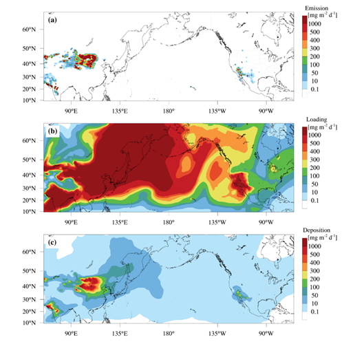 张小啸研究发现,2017年的东亚强沙尘暴起源于中亚和东亚的沙漠戈壁,蒙古高原的戈壁沙漠是主要尘源区,观测到最大瞬时风速约23至24米/秒,波及东亚广大地区。北京、首尔和东京的雷达观测站均观测到沙尘传输过境的强烈信号,我国87%的国土面积受到影响,约7天左右东亚沙尘可抵达北美大陆。此次强沙尘暴事件造成我国316个城市空气质量显著降低,北方大部分城市颗粒物浓度超过空气污染标准的最大阈值,其中鄂尔多斯、呼和浩特和阿拉善等地PM10浓度超过2000ug/m3,约20.4Tg(百万吨)风蚀沙尘沉降在东亚大陆地区,约5.3Tg沙尘沉降在北太平洋地区。