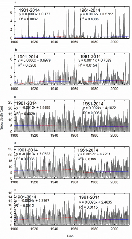 Different trends of snow depth in the Tianshan Mountains during observed period (1961–2014), historical period (1901–1960), and overall period (1901–2014).