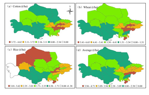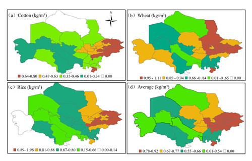 棉花、小麦、水稻、玉米、果树、蔬菜等主要作物的产量,系统分析了咸海流域过去15年(2000-2014年)水土资源开发及其利用效率在时间和空间上的变化。