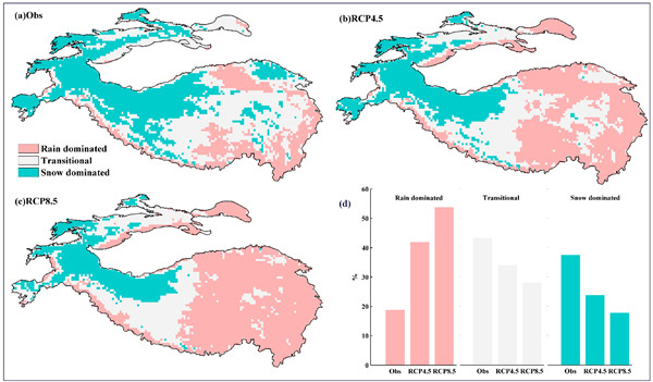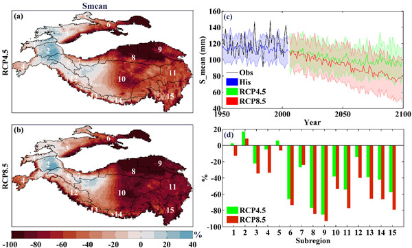 研究结果表明:尽管NASA的NEX-GDDP高分辨率的每日降尺度数据集可以成功捕获平均降雪气候的分布,但它对极端降雪的刻画有较大误差。未来随着温度升高,尤其是冬季温度的增加,在RCP4.5和RCP8.5排放情景下,会导致降雪量分别减少18.9%和32.8%,降雪天数减少29.6%和47.3%,降雪率减少26.7%和42.3%。此外,在高排放情景下,以降雨为主的地区预计将扩大到53.9%,而以降雪为主的地区则会仅占整个高亚洲的17.9%。从空间上看,高亚洲东部的东天山、东昆仑、祁连山以及南部和东部西藏及横断山一带的降雪率降幅比西部的帕米尔高原和喀拉昆仑山的降幅更大,这种差异可归因于两地气候、海拔以及独特的季节循环差异。