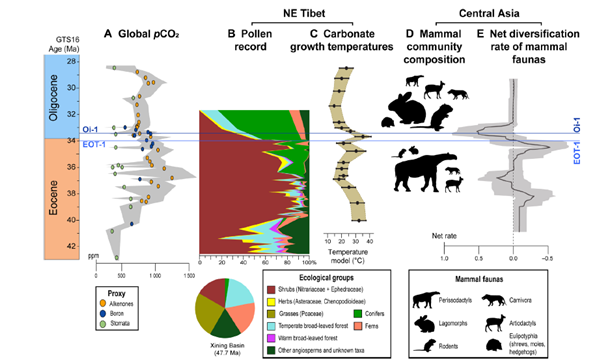 研究发现,中亚荒漠草原在始新世-渐新世气候转变时期迅速变冷变干,并造成灾难性的变化。低海拔地区变成了几乎没有植被覆盖的干旱荒漠。由于缺乏食物,大型动物被啮齿类和兔类等小型动物所替代。这一时期是中亚生态系统演化的重要节点,并塑造了现代生态系统的原型。在中新世气候适宜期,禾本科等草本植物开始在中亚低海拔地区大面积扩张。此时的植被与始新世-渐新世气候转变时期的植被完全不同。
