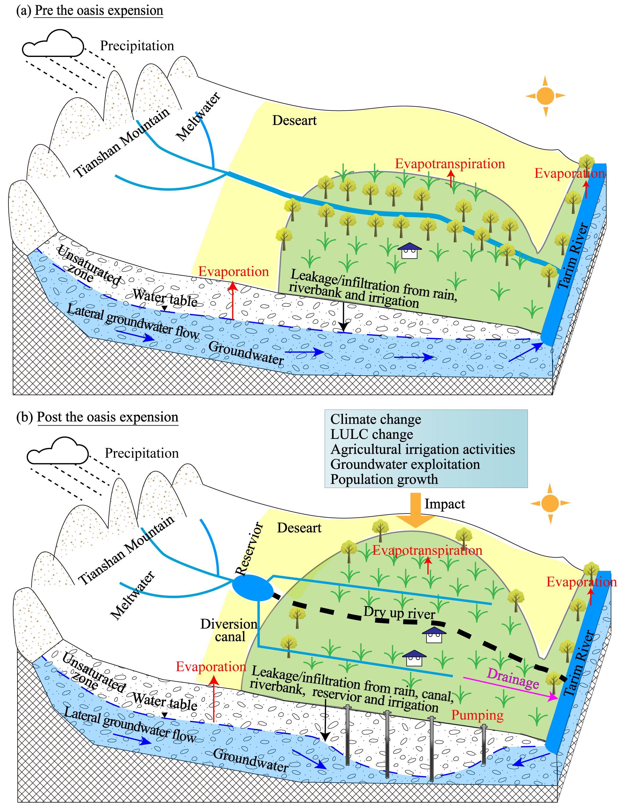 图1 塔里木盆地典型绿洲扩张前后地下水循环过程概念图