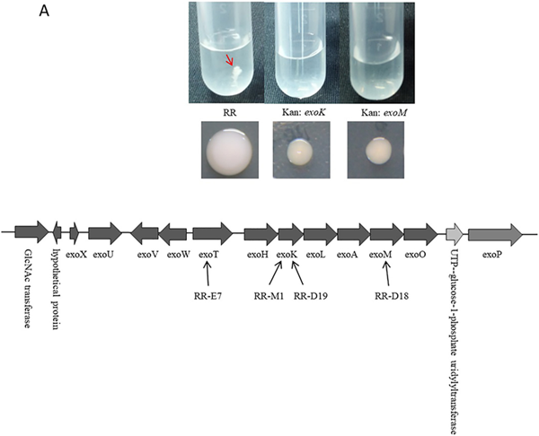 A :菌株Rhizobium radiobacter SZ4S7S14的EPSI合成相关基因簇鉴定。B:菌株Rhizobium radiobacter SZ4S7S14不同碳源条件下的时间表达模