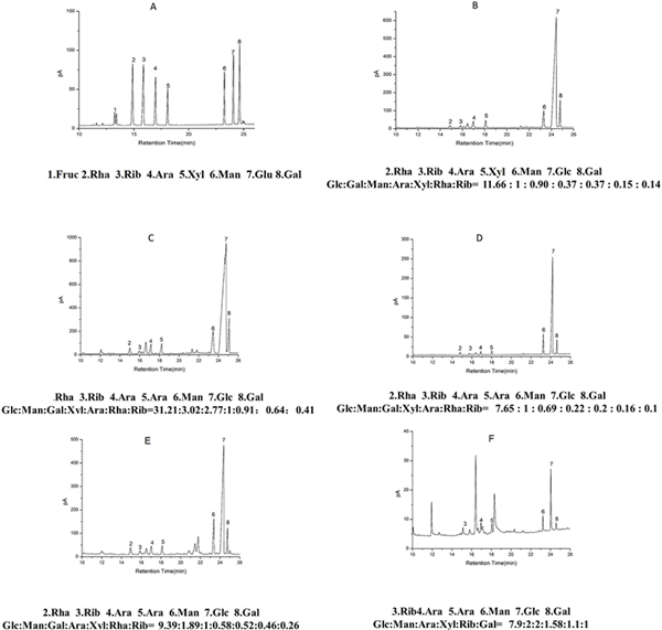 标准碳水化合物吸收峰(A):菌株Rhizobium radiobacter SZ4S7S14在NaCl为0%时胞外多糖的吸收峰;(B) 0.25%;(C) 0.5%;(D) 1.0%;(E)2.0%;(F) 加NaCl的ISP2培养基样品