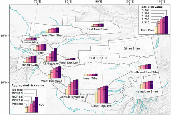 针对上述问题,中国科学院新疆生态与地理研究所荒漠与绿洲生态国家重点实验室包安明研究员团队与瑞士日内瓦大学、苏黎世联邦理工学院以及中国科学院青藏高原研究所等国内外多家研究机构合作定量评估了第三极地区冰湖发展趋势及其当前和未来可能面临的潜在冰湖溃决洪水灾害和风险。研究结果表明,喜马拉雅东部地区是目前第三极冰湖溃决洪水发生的热点地区,其风险水平是临近其他区域的两倍多。然而,随着冰川的进一步消退,未来第三极地区面临的冰湖溃决洪水风险将可能接近于当前的三倍,同时位于西部的喀喇昆仑等地区将可能成为新的热点地区。研究同时强调了加强国际合作、共同防范潜在跨境洪水的迫切性和重要性。