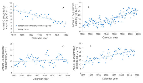 不同时期天山雪岭云杉地上生物量固碳能力变化(A)1850–1880; (B) 1881–2017; (C) 1881–1950; (D) 1951–2017