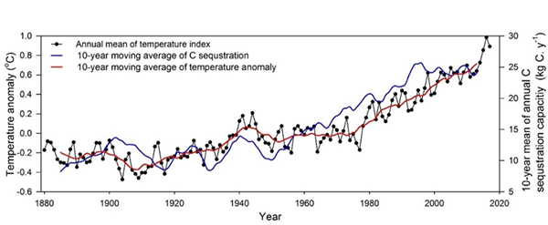 全球温度指数与天山雪岭云杉固碳能力关系