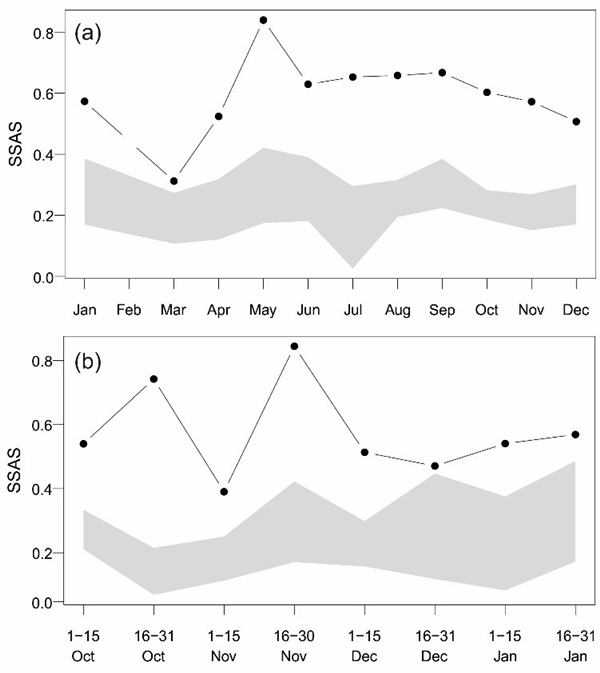 图中观察值(黑点)在预期区间(灰色区)上部,表明雌雄个体以分离为主;观察值在预期区间下部,表明二者聚集分布;观察值在预期区间之间,表明二者随机分布。