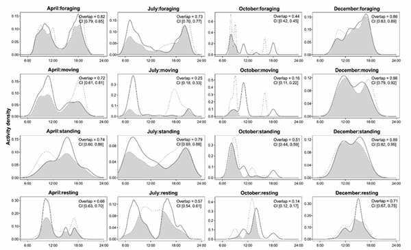 第一至第四排分别为采食、移动、站立和休息。灰色区域表示雄性和雌性行为时间分配重叠系数。重叠系数范围为0(无重叠)至1(完全重叠)。