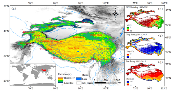 图1(a)高亚洲地区:主要包括青藏高原、天山、帕米尔高原、昆仑山和祁连山。1982-2015年HMA生长季(b)NDVI、(c)气温(Tmp)和(d)降水(Pre)的空间分布。