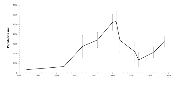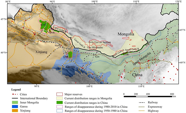 研究结果表明,由于人类活动的过度干扰,中国蒙古野驴的分布区急剧地缩小和碎片化,现存种群数量为4000匹左右,其中约80%分布于新疆卡拉麦里山有蹄类野生动物自然保护区(简称卡山保护区)。自2005年以来,由于一系列人类活动的影响,卡山保护区蒙古野驴种群数量剧烈波动,随着生态修复工作的完成,种群数量已显著回升。中蒙边境地区的蒙古野驴种群数量较少,依赖于跨界流动,目前在两国边境架设的围栏严重阻碍了蒙古野驴种群的跨国交流。