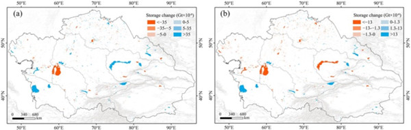 图2. 1990–2020年中亚湖泊 (a)最大蓄水量时的变化和(b)最小蓄水量时的变化