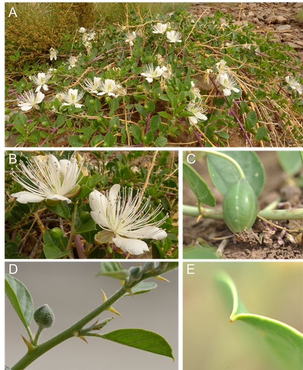 刺山柑(Capparis spinosa)是多年生藤本半灌木,为山柑科(Capparidaceae)山柑属(Capparis)植物,起源于西亚或中亚干旱地区,在中国主要分布在新疆、西藏、甘肃等地。刺山柑具有抗旱能力强、耐风沙、耐贫瘠、耐高温等特征,在中国主要作为药用植物和防沙植物。其化学成分复杂,具有抗氧化、抗菌、抗癌、保肝等药理作用,民间用于治疗关节炎、肩周炎等。刺山柑在欧洲地中海区域也有广泛分布,在塞浦路斯、马耳他和意大利等地非常受欢迎,其果实被盐水或醋腌制之后通常作为开胃小吃,花蕾部分通常作为调味料。