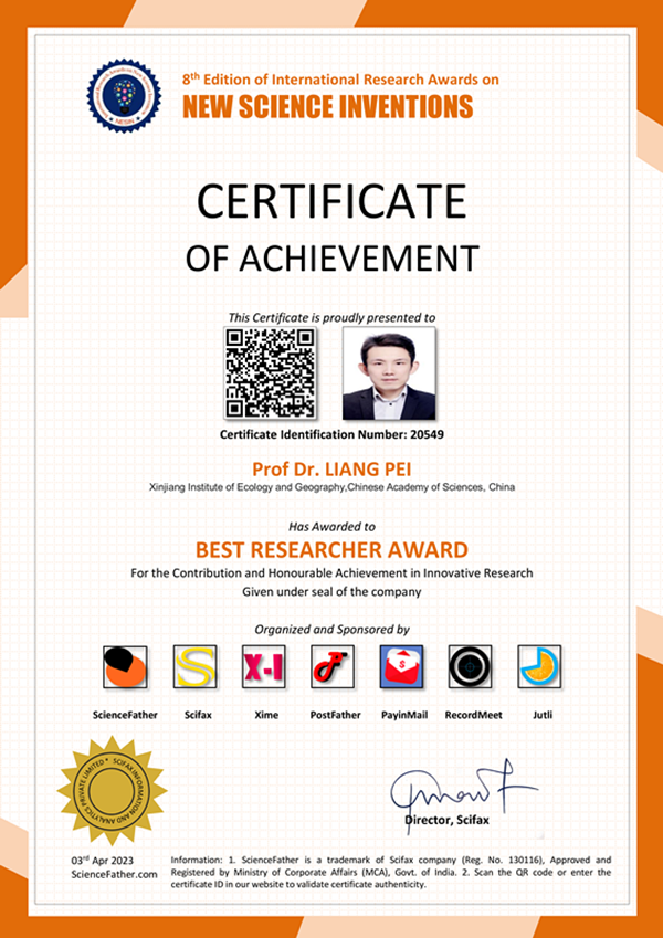 近日,经专家提名和评审委员会多轮评审,国际学术组织ScienceFather授予中国科学院新疆生态与地理研究所国家荒漠-绿洲生态建设工程技术研究中心项目研究员裴亮2023年国际学术“最佳研究者奖”。