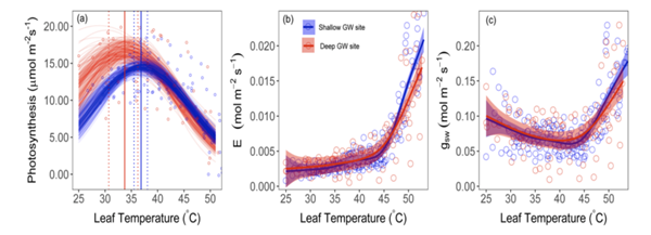 研究结果表明,地下水位下降,梭梭叶片(同化枝)尺寸显著减小,植株冠层高度也显著降低,茎部生物量减少,更多生物量分配到叶片(同化枝);梭梭的叶片光合能力增加,尤其是在叶片温度小于35℃,并且叶片最适光合温度降低;不管是自然或人工种植的梭梭,当叶片温度大于45℃,二者都出现了光合速率下降,但气孔导度和蒸腾速率增加的解耦,是其在高温环境下降低叶片温度的适应策略。研究成果有助于更好地理解荒漠植被适应高温/干旱的机理机制,提高荒漠生态系统碳水循环模型的预测能力。