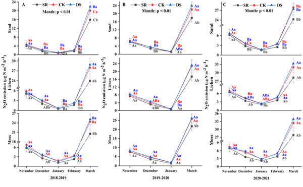 图1 积雪处理对生物土壤结皮N2O排放的影响