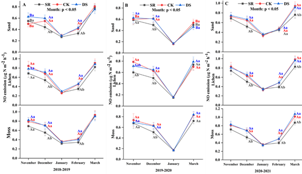 相关研究成果以“Stimulating effects of snow cover on gaseous nitrogen emissions are intensified by biological soil crusts” 为题在线发表于国际学术期刊Geoderma。该研究得到了国家自然科学基金、新疆自然科学基金等项目的资助。