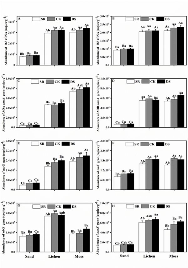 研究结果表明,冬季积雪显著影响裸沙和生物土壤结皮N2O和NO的排放。裸沙和生物土壤结皮中反硝化菌的基因丰度和藓结皮中硝化菌的基因丰度随积雪深度的增加而增加。冬季N2O排放量随生物土壤结皮的发育而增加。裸沙和生物土壤结皮的N2O和NO排放均在冻融期(3月)达到峰值,在仲冬期(1月)最低。N2O排放量随amoA、nirK和nosZ基因丰度的增加而增加。N2O的排放通常随着积雪的增加而增加,这是通过积雪深度变化对氮循环相关功能微生物群的影响而实现的。这些影响受生物土壤结皮类型的调控,在冬季积雪会加剧这些影响的效应。