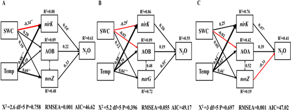 图4 积雪处理下生物因子和非生物因子对生物土壤结皮N2O排放影响的结构方程模型。(A)裸沙,(B)地衣结皮,(C)藓结皮