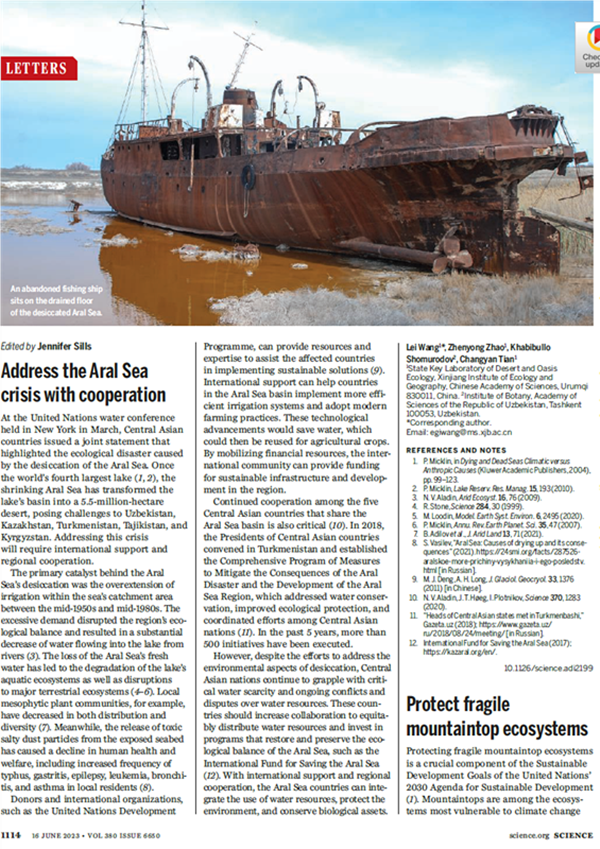 中国科学院新疆生态与地理研究所荒漠与绿洲生态国家重点实验室田长彦研究员团队在6月15日出版的Science发表题为“Address the Aral Sea crisis with cooperation”的评论文章(Letter),分析了咸海危机的危害及成因,提出咸海危机治理的建议,新疆生地所为第一署名单位。