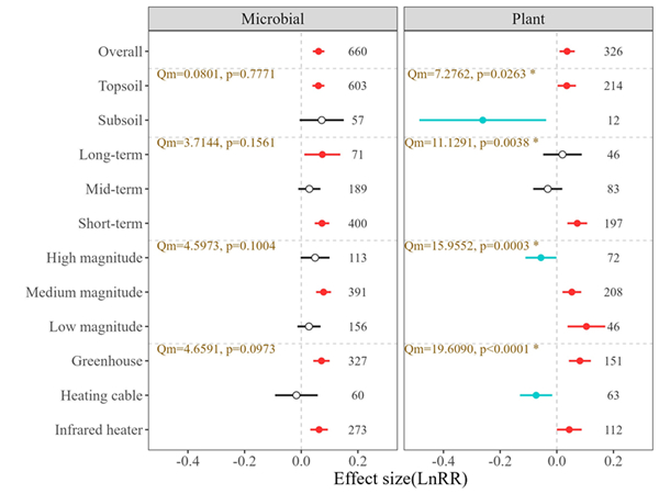 图1 不同源碳对升温条件的响应。设置(温室、加热电缆和红外线加热器)、幅度(低幅度[≤1 ]、中幅度[1~3 ]、高幅度[>3 ])、持续时间(短期[≤3年]、中期[3~6年]、长期[>6年])、深度(表土[0~30厘米]、底土[>30厘米])。红色实心点、蓝色实心点和黑色空心点分别表示显著的正效应、负效应和非显著效应。数字表示每个响应的研究数量。