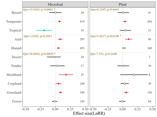 全球变暖对土壤碳库的影响已经得到了广泛的研究,但人们关于微生物源和植物源碳对气候变暖的具体响应仍然缺乏了解。为了填补这一知识空白,中国科学院新疆生态与地理研究所沙漠研究团队对142篇论文进行了meta分析,对986项不同碳源对气候变暖的结果进行了综合分析。
