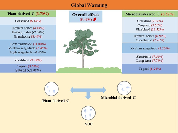 研究结果表明,气候变暖导致陆地碳库平均增加了5.46%,具体来说,微生物源碳平均增加了 6.32%,植物源碳平均增加了 3.70%。其次,虽然气候变暖的持续时间和增温幅度不会显著影响微生物源碳对气候变暖的响应,但却会影响植物源碳的响应。最后,我们观察到不同碳源对气候变暖的响应受特定环境背景的影响。不同碳源对气候变暖反应的差异可归因于碳源本身的性质差异以及它们之间发生的复杂转化的不同。我们建议,应更仔细地考虑土壤-植物-微生物三者间的相互作用,以更好地理解土壤有机碳对全球变暖的响应。