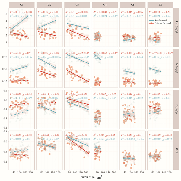 研究结果表明,结皮层土壤的碳和氮含量明显高于结皮下层土壤,而磷含量则远远低于下层土壤。斑块面积大小对土壤养分的影响十分显著,特别是结皮层土壤的氮含量与斑块面积呈显著负相关关系,斑块越大越不利于荒漠土壤对氮素的固持和积累。气候、土壤特性和藓类结皮斑块大小共同影响了结皮层和下层土壤的多功能性,气候因素对结皮层土壤的影响更显著,而土壤特性和藓类结皮斑块大小对结皮下层土壤养分的影响则更大。本研究进一步量化了结皮层和下层土壤养分特征的差异性,揭示了结皮斑块面积作为生物土壤结皮的基本功能单元对荒漠土壤养分特征和功能的影响,具有明显的类似于植被景观斑块的面积效应。研究结果将更好地揭示生物土壤结皮在养分循环中扮演的角色,对干旱地区的土地管理和保护具有实际意义。