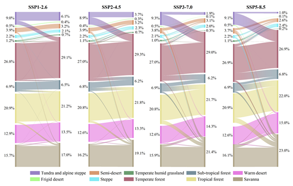 净初级生产力(NPP)是全球陆地生态系统碳循环的重要组成部分,也是衡量陆地生态系统固碳能力的重要指标之一。气候要素如温度、降水和太阳辐射的变化可以影响植被的生长过程,进而使植被NPP发生变化。此外,各类植被的分布与面积会因气候变化而发生改变,这同样对NPP有着重要的影响。因此,综合考虑气候变化和植被演替对分析NPP的变化至关重要。然而,当前我们对不同气候变化情景和植被演替的共同影响下,未来全球陆地生态系统各类植被NPP的变化过程尚不清楚。