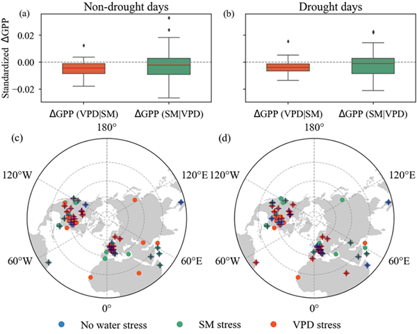 罗格平团队利用北半球公开的89个通量站点的逐日GPP观测数据作为植被生产力的代用指标,通过使用SPEI指数将观测数据分为干旱期和非干旱期,利用分箱法对SM和VPD进行了解耦。