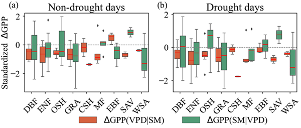 图2. (a)非干旱和(b)干旱条件下不同植被类型的高VPD(橙色)GPP和低SM(绿色)GPP变化箱型图。每个框中的红线表示中值。