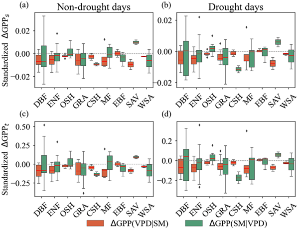 图3. (a)、(c)非干旱和(b)、(d)干旱条件下不同植被类型的高VPD主导(橙色)GPP变化和低SM主导(绿色)GPP变化的箱型图?GPPs是指GPP通过入射短波辐射归一化以消除辐射效应, GPPt是指GPP通过空气温度归一化以消除温度效应。