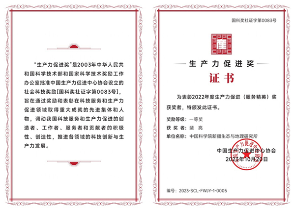 12月12日,在中国生产力促进中心协会举办的“第十六届生产力创新发展大会”上,科技部、中国科协、中国生产力促进中心协会领导出席,为来自全国各行业的41个集体和80名个人颁发了2023年度中国生产力促进奖获奖证书。中国科学院新疆生态与地理研究所国家荒漠-绿洲生态建设工程技术研究中心沙漠研究团队的裴亮研究员荣获一等奖(一等奖共15人)。