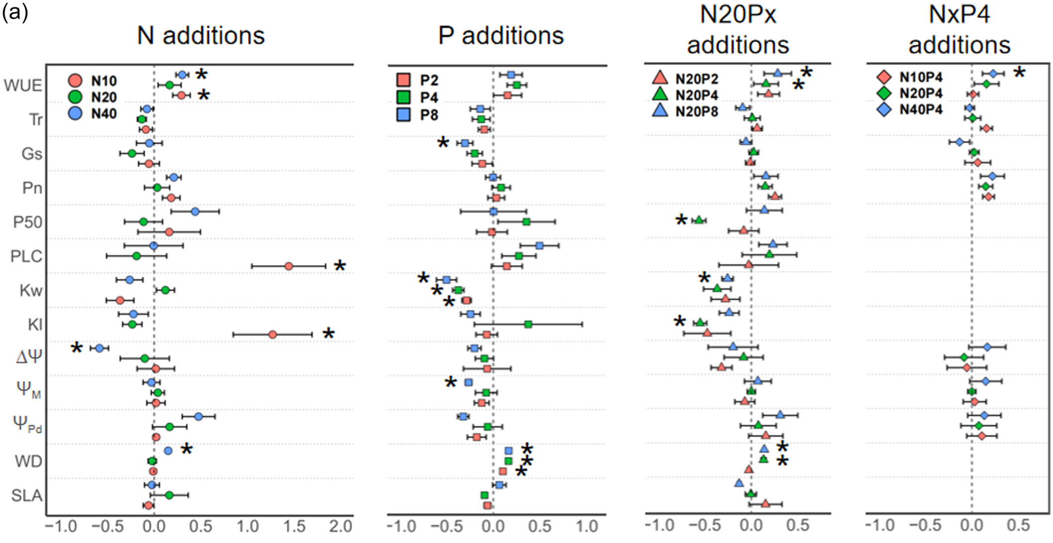 氮(N)、磷(P)是植物生长必需的两种养分元素,氮、磷有效性与植物生长的关系历来都是学者们关注的焦点。目前,在全球范围内已开展了许多氮、磷添加对树木生长和植物功能性状的控制实验,多数研究发现,不同树种的生长对N、P添加的响应不尽相同,这种差异在很大程度上取决于植物功能性状的异同,也会受到多种生物、环境和实验处理条件等因素的影响。与N添加相比,单独P添加以及N、P添加双因子交互实验仅在全球个别区域零星分布。此外,树木生长响应氮、磷添加的生理学机制以及植物功能性状在调节与预测树木生长响应氮、磷添加中的作用尚不明晰。